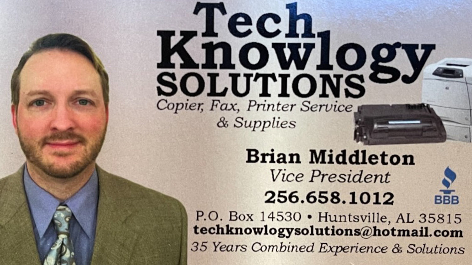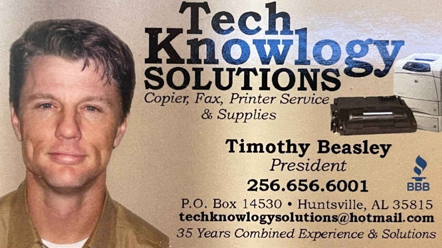 I'm President Tim Beasley, and I've chosen the best printer technicians around. My VP, Brian Middleton, and I work in the shop everyday alongside the team. Our shop is located in Huntsville, AL. So give us a call and talk to a real expert today.